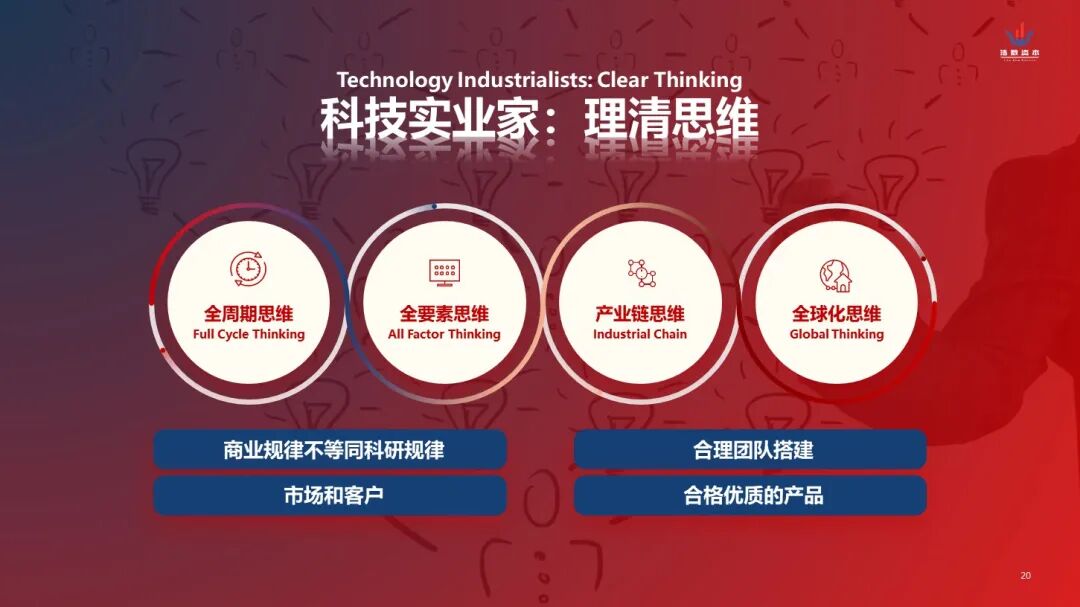 周宇斌认为在现有的企业经营中,CEO的角色更可以定义为——科技实业家。第一点就是,CEO绝对不是单纯的科学家角色,商业规律也不等同于科研规律。第二点,要有团队思维,建立全要素思维。第三点,要有产业链路导向,市场和客户才是未来,任何好的技术和产品,必须经过市场验证。最后,就是要形成全球化思维。