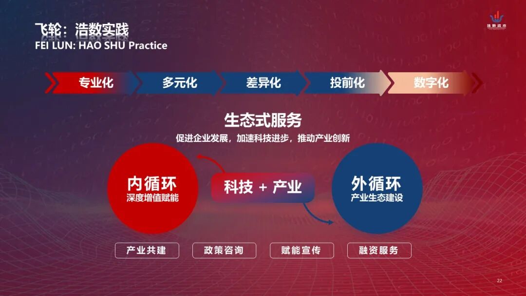 而在实际行动上,周宇斌表示,浩数始终坚持“飞轮”理念,通过产业共建、政策咨询、赋能宣传、融资服务将增值服务的内循环和产业生态建设的外循环打通,从而将赋能服务提升、嵌入浩数·生态体系中。