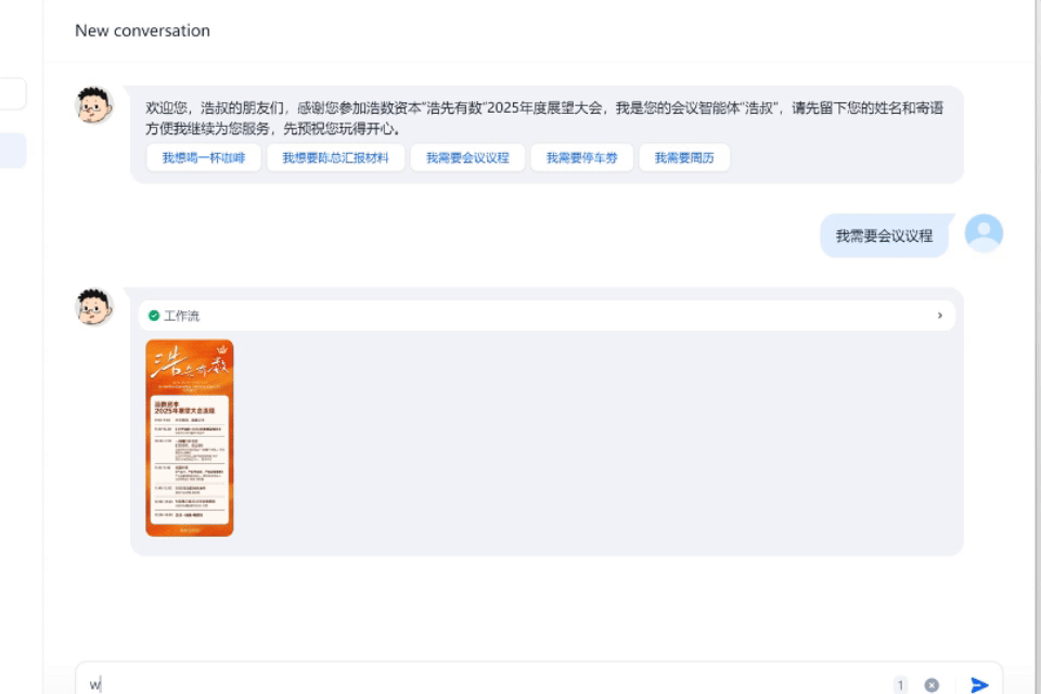 AI 的出现,为我们带来了前所未有的机遇和挑战。在年会上,嘉宾可以通过与 【菜包】 智能体对话,轻松获取会议所需的信息。